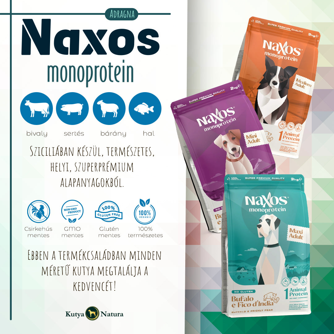 Naxos termékekA Kutya Natura filozófiájához illeszkedően a NAXOS olyan természetes alapanyagokból készült, megbízható és prémium választás, amelyet mindenkinek ajánlunk. A termékcsaládban megtalálható minden méretű kutyának a legmegfelelőbb receptúra és eledel.